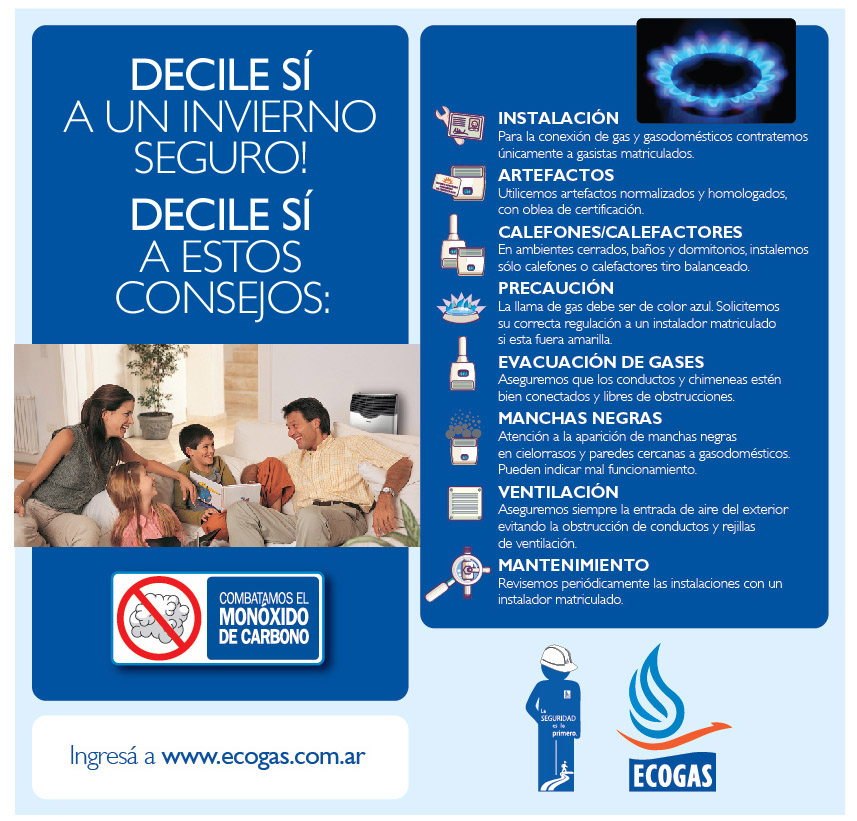 Seguridad: Nunca obstruya las ventilaciones ni los conductos de evacuación de los productos de la combustión. Toda combustión consume oxígeno y puede producir monóxido de carbono. El monóxido de carbono provoca todos los años accidentes fatales que en la mayoría de los casos podrían ser evitados. Para evitarlos, mantenga limpios y regulados los artefactos: con ello aumenta la seguridad y además reduce los consumos de combustibles y mejora el rendimiento.